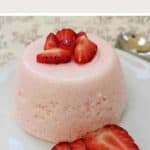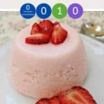 A pink dessert on a white plate with strawberries